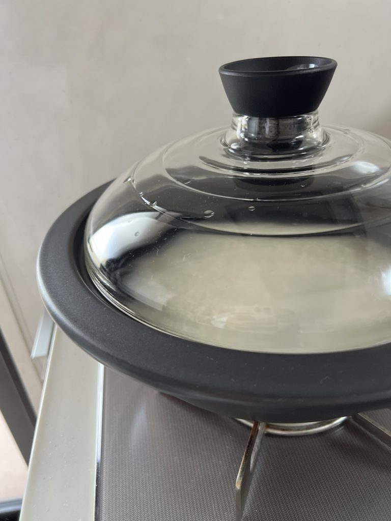 すると、湯気がぼーーーって取っ手のところからでてくるので、火を弱火にして5分ぐらい!